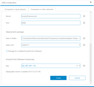 Computers in the same network can be directly accessed from the Enterprise Console server. Therefore you only need to enter admin credentials to copy the setup files into the computer remotely, plus credentials of a local administrator on the target computer to run the installer. The last step before installation can start is to select or specify a license key for Emsisoft Anti-Malware. Enterprise Console will remember your inserted license key for later use on other machines.