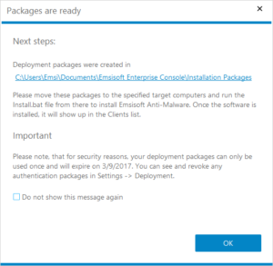 Carefully select a folder to store the newly created installation packages. You will need to copy the files within that folder over to your target machine later. If Emsisoft Anti-Malware is already installed on your client machine but not connected with any Emsisoft Enterprise Console yet, tick the checkbox “Package for installed Emsisoft Anti-Malware”. It will then leave out the large setup.exe file from the package and create the rather small secure authentication files only.