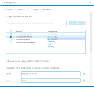 Click “Add computers” in the bottom right corner of the main screen and switch to the “Computers in other networks” tab at the top. Type the full computer name (with workgroup or domain name) and click “Add” to add it to the list of computers to be added. You can change the default settings group in the second column, i.e. “Marketing”, if you already know where that new computer belongs to and what policies you like to apply.